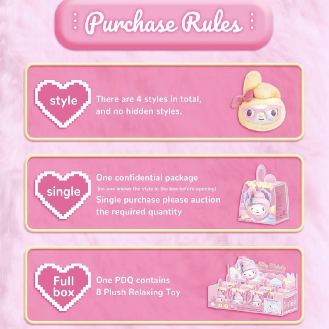 My Melody Bunny Series Plush Vinyl Pendant Blind Box $16.900Sales volumesize1pc no charm1pc 3 charm1pc 5 charmSetInventory shortageshare toproduct detailsHome/Vinyl plush DIY/My Melody Bunny Series Plush Vinyl Pendant Blind Box